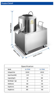 De GL-TP450 is perfect voor het koken van aardappelen. Met een vermogen van 1,5 kW kan hij tot 400 kg/u verwerken, waardoor hij een ideale keuze is voor drukke keukens.Met een rotatiesnelheid van 150 min/u zorgt hij ervoor dat uw aardappelen gelijkmatig en consistent worden gekookt.De grootte van 720×530×930 mm maakt het gemakkelijk te bewaren en te gebruiken in elke keuken.